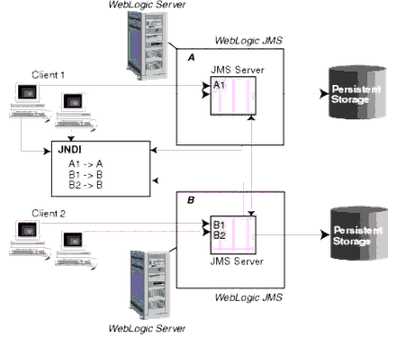 * (A) JMS servers that can host a defined set of modules and any associated persistent storage that