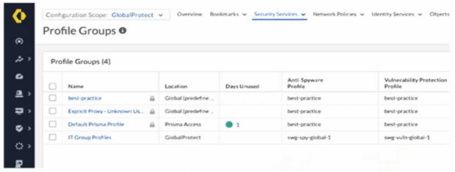 GlobalProtect folder. All security rules are using the Default Prisma Profile. The intern reports that