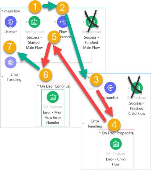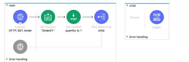 When the main flow is triggered, the Mule event travels through and executes the flow until the