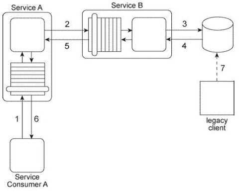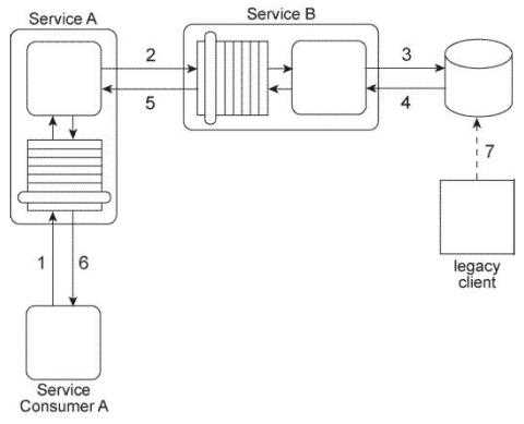 Service A is an entity service that provides a Get capability that returns a data value that is frequently changed. Service Consumer A invokes Service A in order to request this data value (1). For Service A to carry out this request, it must invoke Service B (2), a utility service that interacts (3.4) with the database in which the data value is stored, Regardless of whether the data value changed. Service B returns the latest value to Service A (5), and Service A returns the latest value to Service Consumer A (6). The data value is changed when the legacy client program updates the database (7). When this change happens is not predictable. Note also that Service A and Service B are not always available at the same time. Any time the data value changes. Service Consumer A needs to receive it as soon as possible. Therefore, Service Consumer A initiates the message exchange shown in the Figure several times a day. When it receives the same data value as before, the response from Service A is ignored. When Service A provides an updated data value, Service Consumer A can process it to carry out its task. Because Service A and Service B are not always available at the same times, messages are getting lost and several invocation attempts by Service Consumer A fail. What steps can be taken to solve this problem?