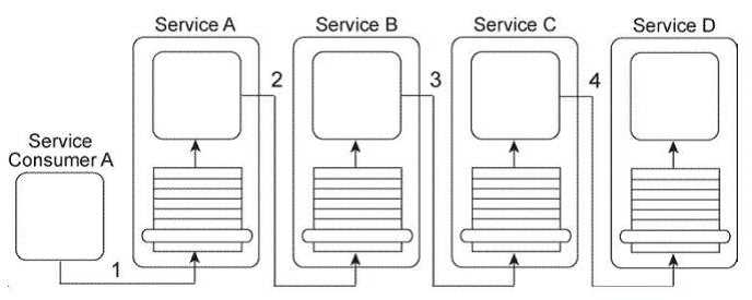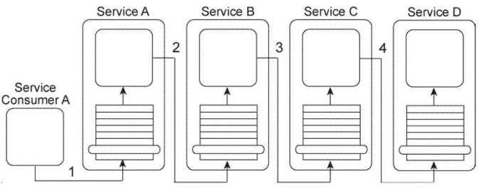 Service Consumer A sends a message to Service A (1), which then forwards the message to Service B (2). Service B forwards the message to Service C (3), which finally forwards the message to Service D (4). Services A, B, and C each contain logic that reads the content of the message and, based on this content, determines which service to forward the message to. As a result, what is shown in the Figure is one of several possible runtime scenarios. You are told that the current service composition architecture is having performance problems because of two specific reasons. First, too many services need to be explicitly invoked in order for the message to arrive at its destination. Secondly, because each of the intermediary services is required to read the entire message contents in order to determine where to forward the message to, it is taking too long for the overall task to complete. What steps can be taken to solve these problems without sacrificing any of the functionality that currently exists?