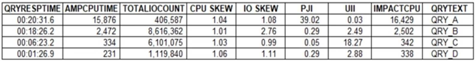 An Administrator has been presented with these performance metrics from the DBQLOGTBL table for