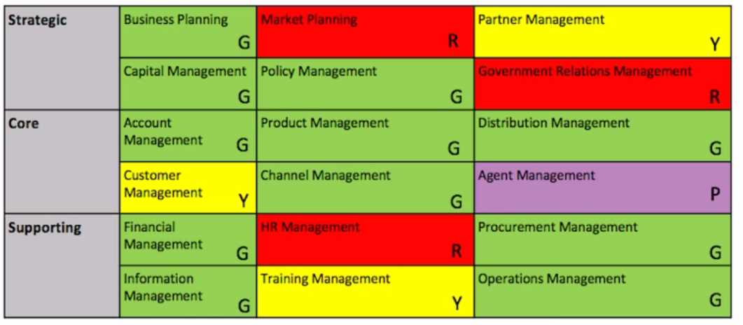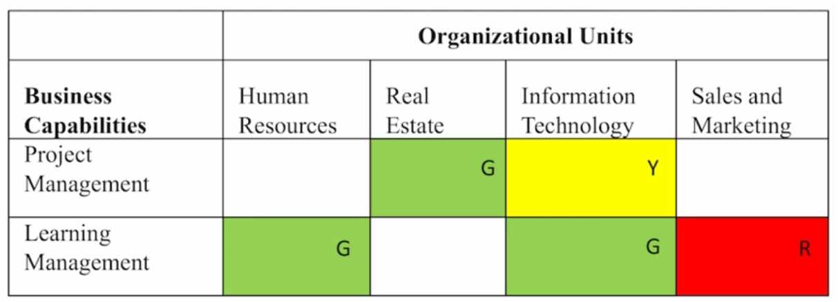 Consider the following business capability map. where cells of a model are given different colors to